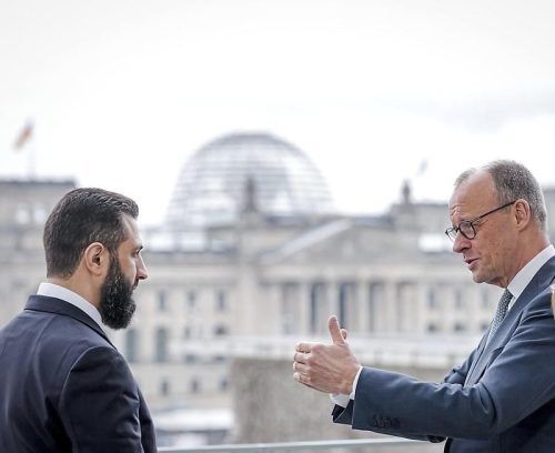 Wer hat es gesagt? Weder Kanzler Friedrich Merz (r.) noch Syriens Übergangspräsident Ahmed al-Scharaa wollen die 80 Prozent als Zielmarke genannt haben. © Kay Nietfeld/dpa