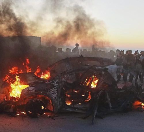 Ein Fahrzeug in Gaza steht nach einem Angriff in Flammen. © Al Zanoun/dpa