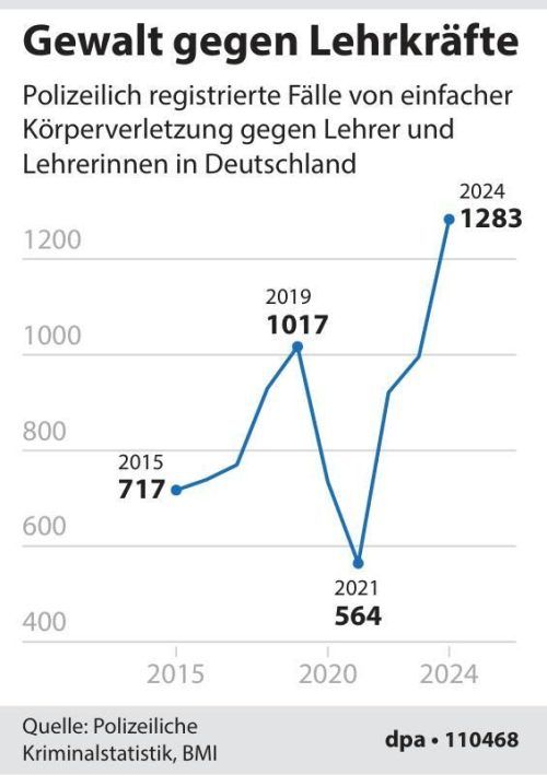 Berlin – Lehrer erleiden in Deutschland immer öfter Körperverletzung und andere Formen von Gewalt. 2024 wurden 1283 Lehrer und Lehrerinnen vorsätzlich verletzt, wie eine aktuelle Auswertung der Polizeilichen Kriminalstatistik zeigt. Zum Vergleich: In den Jahren 2015 bis 2023 meldeten die Polizeibehö
