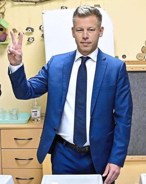 Peter Magyar von der Oppositionspartei zeigt nach der Stimmabgabe das Victory-Zeichen. Das Bild recht zeigt seinen Kontrahenten Viktor Orban kurz vor dessen Stimmabgabe. © dpa