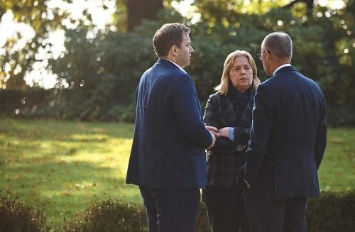 Streiten im Walde: Kanzler Friedrich Merz (CDU, re.) mit Vizekanzler und Finanzminister Lars Klingbeil und Arbeitsministerin Bärbel Bas (beide SPD) vor der Villa Borsig. © dpa