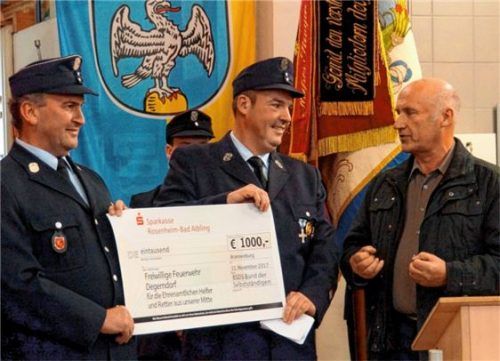 Logistik-Gerätewagens der Feuerwehr Degerndorf (wir berichteten) überraschte Bernhard Fischbacher (rechts), Vorsitzender des Gewerbeverbandes „Bund der Selbständigen“ in Brannenburg, Kommandant Hans Buchberger (links) und den Feuerwehr-Vorsitzenden Matthias Kuchler mit einem