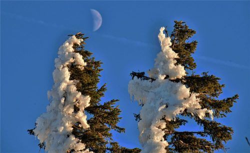 Während der Winter in den Tälern noch auf sich warten lässt, eröffnen sich Ausflügler, die den Weg in höhere Sphären auf sich nehmen, traumhafte Eindrücke, die so nur in der kalten Jahreszeit gesammelt werden können. So haben sich Schnee und Eis an diesen Nadelbäumen auf der Kampenwand bei Aschau fe