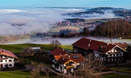 Gerade kommt die Morgensonne über die Hochries, da wird der Alpenföhn immer stärker und treibt die dichten Nebelschwaden davon. Diese Aufnahme wurde von der Aussichtskapelle Obereck/Samerberg mit Blick in Richtung Chiemsee aufgenommen. Der Chiemsee ist noch völlig im Nebel verschwunden. Höhenmoos (i