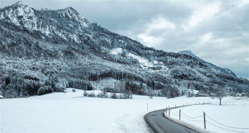 Konnten so manche Bewohner des Inntals bereits vom kommenden Frühling träumen, so sehen sie sich nun ein weiteres Mal mit Schnee und Eis konfrontiert, wie hier bei Nußdorf am Fuß des Heubergs. Rechts, hinter den Ausläufern des Heubergs fast verborgen, das Kranzhorn. Der plötzliche Wintereinbruch bes