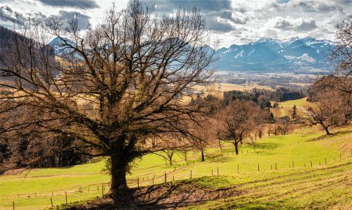 Blick von Brunn am Samerberg in Richtung Wendelstein: Die Sonne schmilzt dahin, das Tageslicht wird immer länger und an den Bäumen wird das erste Grün sichtbar. Dies zusammen mit der hügeligen Landschaft des Samerbergs und den mächtigen Bergen im Hintergrund ergeben diese fast malerische Aufnahme. U
