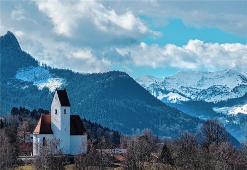 Blick über Grainbach am Samerberg hinweg auf den Großen Traithen jenseits des Inntals, der mit Schnee bedeckt immer noch hochalpin wirkt. Er ist auch der höchste Gipfel in der Kette der Berge ums bayerische Inntal, 14 Meter höher noch als der Wendelstein. Links über der Grainbacher Kirche sieht man