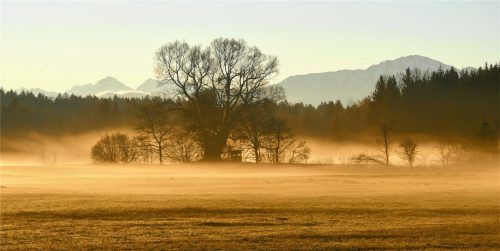 Auch wenn es gestern in der Früh empfindlich kalt war – als sich am frühen Vormittag der Hochnebel langsam aufgelöst hatte und die Sonne die Oberhand gewann, präsentierte sich die Region wie hier bei Eggstätt von ihrer schönsten Seite. Zarte Nebelschleier tauchten die Felder und Wiesen in einen myst