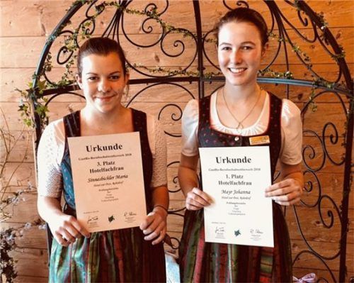 Beim jährlich stattfindenden Gastro-Award der Hotelfachleute in der Berufsschule schnitten die Auszubildenden des Hotels „Zur Post“, Rohrdorf, wieder erfolgreich ab. Johanna Mayr (rechts) belegte den ersten Platz, Maria Sinnesbichler (links) den dritten Platz. Zum Prüfungsinhalt der Hotelfachleute g