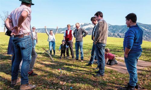Die günstige Witterung am Ostermontag freute alle Ausflügler, besonders aber die Trachtler in Roßholzen. Sie konnten ihr traditionelles Oarscheibn bei schönem Frühlingswetter am Trachtenstadl in Hundham abhalten. Zwei große Rechen wurden so über Kreuz gelegt, dass die Stiele zusammen eine kleine Bah