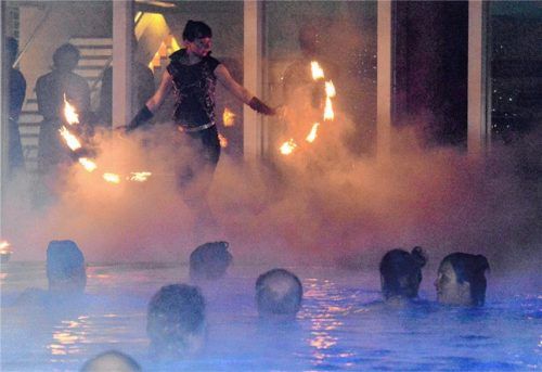 Der Feuertanz im Außenbereich der Chiemgau-Thermen-Landschaft in Bad Endorf war der stimmungsvolle Höhepunkt des Lichterabends. Eine Feuerakrobatin zeigte, welch sehenswerte Kunststücke mit dem heißen Element möglich sind. Die Badegäste verfolgten das Geschehen vom Wasser aus und waren begeistert.Fo