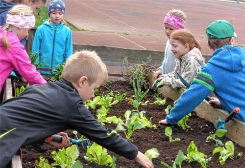 Begeistert wühlen 36 Kinderhände in der Erde: Die Klasse 2a mit ihrer Lehrerin Anna Boldinger von der Riederinger Anette-Thoma-Schule bepflanzte unter Anleitung von Thomas Pummerer, Vorstand des Gartenbauvereins Riedering, das Hochbeet am Schulsportplatz. In Zwiebel-, Salat- und Kartoffelgruppen ein