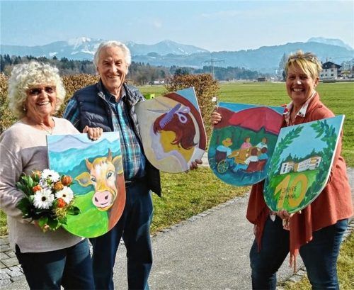Die Vorbereitungen für das Maibaumfest in „St. Anna“ in Rohrdorf laufen: Die Kunstschaffende Rosmarie Zarecky-Seil (links) überreichte gemeinsam mit ihrem Partner Fred Leimböck der Pflegedienstleitung Karin Stöhr die Tafeln für den Maibaum. Er wird im Innenhof des Seniorenheims am Sonntag, 6.Mai, um
