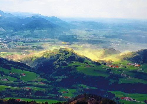 Wie eine riesige Fahne zieht sich der Blütenstaub über den Samerberg. Das Bild mailte uns der Hochries-Hüttenwirt Manuel Hohenegg.
