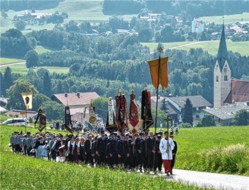 Gleich zwei Fronleichnamsprozessionen werden traditionell auf dem Samerberg durchgeführt. Die erste führte gestern von der Pfarrkirche „Mariä Himmelfahrt“ hinauf zur Aussichtskapelle in Obereck. Der feierliche Zug mit der Musikkapelle Samerberg und mit den Ortsvereinen gab bei schönstem Wetter ein e