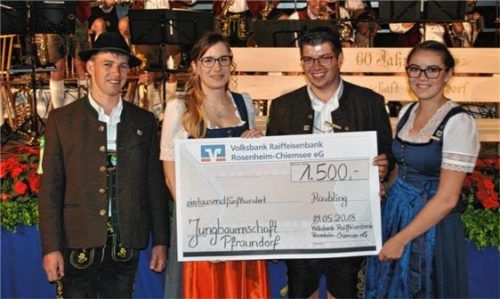 Mit einem Scheck in Höhe von 1500 Euro im Gepäck überraschte Martina Theil, Vermögensberaterin der Volksbank Raiffeisenbank in Raubling, die Jungbauernschaft Pfraundorf zur Festwoche. Die großzügige Zuwendung soll als finanzielle Unterstützung für das 60. Vereinsjubiläum dienen.