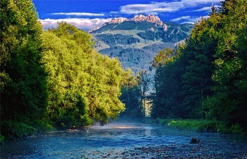 Dunkelblauer Himmel, weiße Wolkenfetzen und Bäume, Wiesen und Waldflächen auf der Kampenwand in den unterschiedlichsten Grüntönen: Die Natur des Prientals bietet ein Farbenspektrum wie ein Malkasten für den Kunstunterricht. Einen Ausblick wie ein Aquarell bietet beispielsweise diese vor allem bei Gr