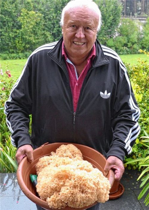 Bei strömenden Regen hat Johann Lindner aus Haidholzen in der Baierbacher Filze am Simssee diese riesige, etwa drei Kilo schwere „Krause Glucke“ gefunden. „Jetzt hat es geregnet, und da sind die Schwammerl förmlich aus dem Boden geschossen. Dieser war innerhalb von zwei Tagen da“, erzählte der passi