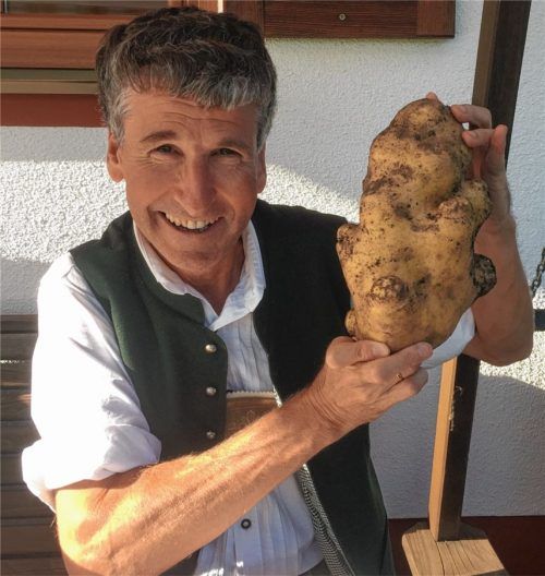 Nicht nur beim Crosslaufen hängt Reinmund Hobmaier regelmäßig die Konkurrenz ab. Wie man sieht, belegt der bayerische und deutsche Meister im Crosslauf auch bei der Kartoffelernte einen Spitzenplatz. Seine Schwägerin Leni Feichtner aus Schechen hat den Athleten samt Riesenknolle vor die Linse genomm