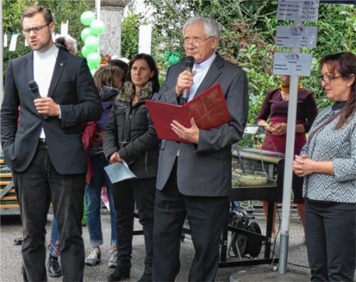 Die katholischen und evangelischen Christen Großkarolinenfelds trotzten dem Regen. In Scharen kamen sie zum ökumenischen Pfarrfest am Kirchplatz, wo die beiden Pfarrer Richard Graupner (links) und Pfarrer Drago Curic mit Wortgottesdienstleiterin Petra Neumayer (rechts) das Fest eröffneten. Christian