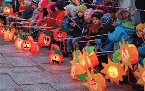 In einem kurzen Gottesdienst wurde auf dem Rathausplatz in Schloßberg an die gute Tat des heiligen Martin erinnert. Aufmerksam lauschten die Kinder von St. Georg dem Spiel und sangen beim anschließenden Martinszug kräftig mit. Das Wegstück durch den Garten des Kindergartens wurde von unzähligen Wind