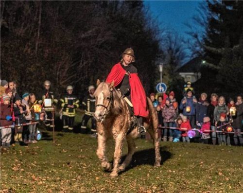 Auch der Kindergartenverein Degerndorf/Brannenburg feierte sein alljährliches Martinsfest. Im Sternmarsch gingen die Kinder mit selbst gebastelten Laternen und singend zur Kirche. Dort kam St. Martin auf einem Pferd geritten und teilte den Mantel mit dem Bettler. Nach den Martinsspiel gingen alle in