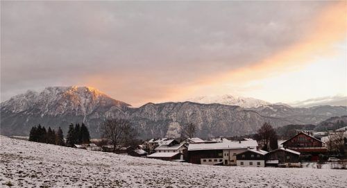 Das Kaisermassiv, von Oberaudorf aus fotografiert. Links sieht man den Zahmen, dahinter etwas rechts den Wilden Kaiser, schneebedeckt und von der Abendsonne beschienen. Foto Hoffmann