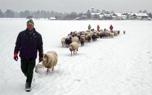 Ob sie sich schon auf dem Weg zum Stall in Betlehem befinden? Ihre Sommer- und Herbstweide haben die Schafe des Priener Schäfers Martin Kollannsberger in Frasdorf jetzt jedenfalls verlassen. Bei romantischem Schneefall ging es vorbei an den Kirchen St. Florian und Wildenwart zurück in die Priener St
