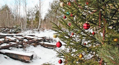 Farbenfrohe Überraschung neben den Gleisen der Bockerlbahn in der Nicklheimer Fuizn bei Raubling: Eine Fichte ist als Christbaum geschmückt worden, mit bunten Kugeln, Holzanhängern in Herzerl- und Sternform und Äpfeln aus Kunststoff. Ein lebender Christbaum, denn er wächst in der Fuizn und wird auch