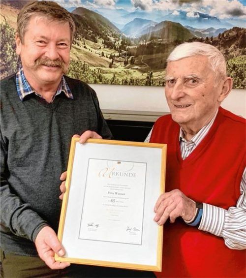 Eine besondere und zugleich einzigartige Ehrung konnte bei der Jahreshauptversammlung der Kolpingsfamilie Aschau überreicht werden. Vorsitzender Hans Berghammer übergab Fritz Wanner eine Urkunde für seine 65-jährige Mitgliedschaft. Die Augen von Fritz Wanner leuchteten, als er die Ehrenurkunde aus d