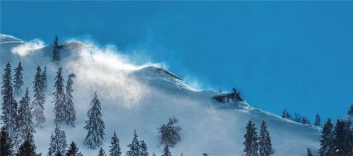Die exponierte Lage der Seitenalmen an der Flanke der Hochries hilft beim Räumen der Dächer – dort macht´s der Wind. Zumindest sieht es auf dem Foto so aus. Auf vielen Hüttendächern in den Voralpen muss geschaufelt werden, damit durch den hohen Schneedruck keine Schäden entstehen.Foto stm