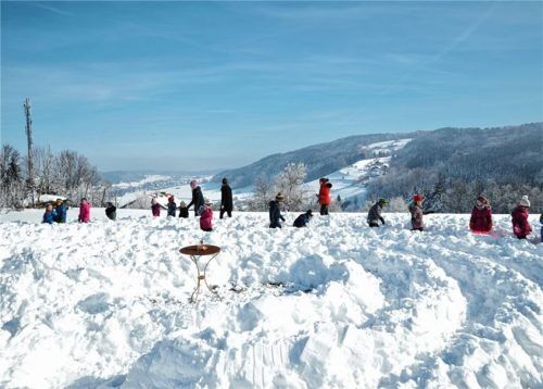 Das herrliche Winterwetter inspiriert zu ebenso herrlichen Ideen. In Hirnsberg wurde ein klassisches Labyrinth mit sieben Umgängen in den Schnee geschaufelt. Die Kinder des Kindergartens hatten ihre Freude daran: Brav marschierten sie im Gänsemarsch den langen Weg bis zum Ziel in der Mitte. Dort kon