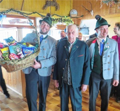 Seinen 90. Geburtstag konnte Josef Fembacher aus Brunn feiern. Vorsitzender Martin Schober vom Trachtenverein „Almenrausch“ Roßholzen und sein Stellvertreter Max Maurer (links) gratulierten dem Jubilar, überreichten einen Geschenkkorb und dankten für seine Hilfsbereitschaft im Trachtenverein. Bereit