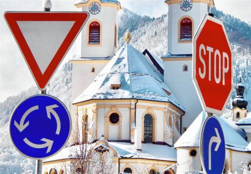 Nicht nur die beiden Türme der imposanten Aschauer Pfarrkirche ragen aus der weißen Pracht empor, sondern auch noch andere farbenfrohe Gegebenheiten. Zwei reichlich bestückte Verkehrsstangen rekeln sich wett mit dem zweier Gestirn des Gotteshauses. Hier heißt es nicht den Überblick zu verlieren, sei