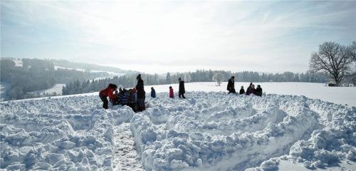 Das herrliche Winterwetter inspiriert zu ebenso herrlichen Ideen. In Hirnsberg wurde ein klassisches Labyrinth mit sieben Umgängen in den Schnee geschaufelt. Die Kinder des Kindergartens hatten ihre Freude daran: Brav marschierten sie im Gänsemarsch den langen Weg bis zum Ziel in der Mitte. Dort kon