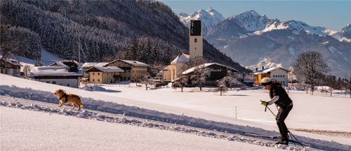Viel Freude haben die Langläufer derzeit bei den gut gespurten Loipen auf dem Samerberg. Im Hintergrund der Ortsteil Roßholzen. Foto Nitzsche