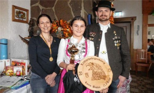 Laura Besten (Mitte) von der SG Endorf hatte den besten Schuss auf die Königsscheibe. Sie verwies damit den Hittenkirchener Simon Schnaiter vor Pina Schneider von den Sägschützen auf die weiteren Plätze. Von den insgesamt 44 Teilnehmern waren allein 14 Sägschützen (Sylvia Fischer links) und damit do