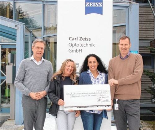 Senior Director Manfred Dollansky (links) und Geschäftsführer Markus Eßer (rechts) von der Carl Zeiss Optotechnik in Neubeuern übergaben eine Spende in Höhe von 2250 Euro an die Rosenheimer Aktion für das Leben. Geschäftsführerin Manuela Damköhler berichtete von ihrer Arbeit: Sie geht in die Familie