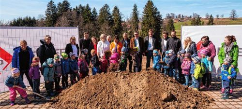 In der Gemeinde Samerberg haben die Bauarbeiten für den neuen Kindergartens nun begonnen. Einige Tage früher als geplant rückten die ersten Baumaschinen auf das Grundstück neben der Samerberger Halle und der bestehenden Kinderkrippe an. Bürgermeister Georg Huber konnte gestern beim Spatenstich eine
