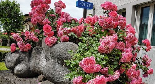 So mancher ist auf Rosen gebettet. Der „schlafende Bürger“ vor dem wachsamen Auge der Polizei in Brannenburg jedoch ist unter Rosen gebettet. Schatten spenden die rosa Ranken allerdings nicht so wahnsinnig viel und sind bei sommerlichen Temperaturen eher dekorativ als erfrischend. Foto Stephan