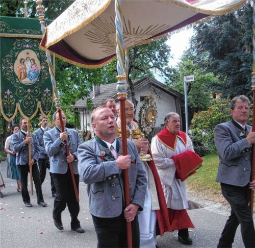 An Fronleichnam zogen die Gläubigen von Prutting nach dem Festgottesdienst in einer langen Prozession durchs Dorf. Voran die Ortsvereine mit ihren Fahnenabordnungen und die Landjugend mit den geschmückten Figuren. An den vier geschmückten Altären wurden Lesungen und Fürbitten vorgetragen. Umrahmt wu