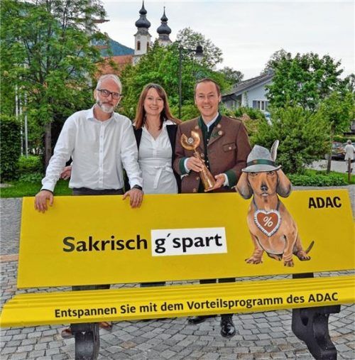 Ein echter Hingucker: Das neue Bankerl des ADAC in strahlendem Gelb und mit Dackel „Franzl“ zieht die Blicke direkt im Ortskern von Aschau auf sich. Darüber freuen sich (von links) Markus Dehm, Leiter Marketing ADAC Südbayern, Heike Tröster, Projektleiterin des ADAC Tourismuspreises Bayern, und Herb