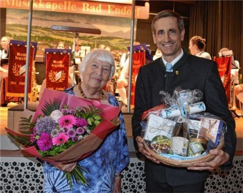 Das gut besuchte Sommerkonzert der Musikkapelle Bad Endorf im Kultursaal am Park der Chiemgau-Thermen mit bekannten Melodien aus ganz Europa bildete den Rahmen für eine besondere Gästeehrung. Evelyne Heyse (89) aus Oberfranken kommt seit 25 Jahren jedes Jahr für mehrere Wochen aus Bamberg nach Bad E