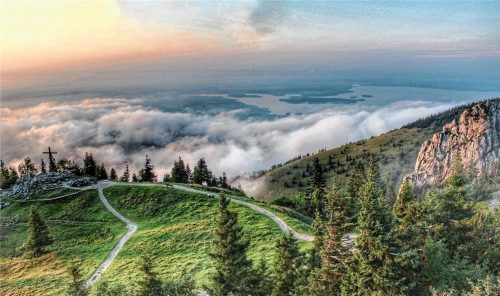 Die letzten Wanderer sind ins Tal zurückgekehrt, und auf dem Kalkgestein der Kampenwand kehrt wieder Ruhe ein. Ein Regenschauer ist vorübergezogen, das Abziehen der Wolkenbanner legt eine Traumwelt offen. In Pastellfarben verabschiedet sich der Tag über Aschau. Im Hintergrund schlummert der Chiemsee