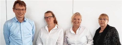 Die PharmaZell GmbH in Raubling – links Personalleiter Rolf Flügel, rechts Petra Ganter, Assistenz der Werkleitung – hat mit der Spendenübergabe in Höhe von 2500 Euro an Gitti Baumann (Zweite von rechts) und Claudia Rieger (Zweite von links) vom Bayerischen Roten Kreuz und Organisatorinnen der Raubl