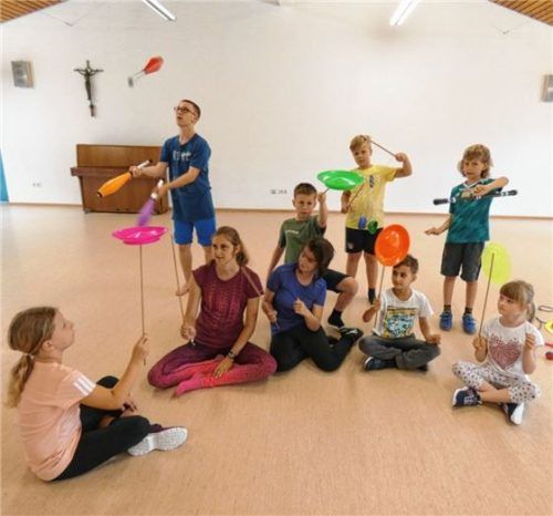 Manege frei hieß es beim Ferienprogramm in Großkarolinenfeld. Die jungen Künstler übten fleißig unter der Leitung von Zirkusdirektorin Luise Grimmeisen (Zweite von links) verschiedenste Kunststücke wie Jonglieren, Teller drehen, Diabolo werfen und vieles mehr. Die Kinder hatten sehr viel Spaß und ze
