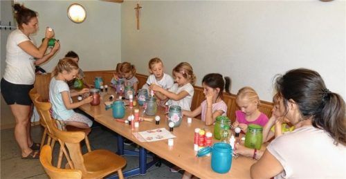 Nachtlichter aus Einweckgläsern basteln stand auf dem Programm des Ferienprogramms in Großkarolinenfeld. Zehn Mädchen und zwei Buben folgten der Einladung mit Begeisterung. Unter der Leitung von Patricia Lösch (links) und Carmen Franz (rechts) entstanden mit Farbe, Folie und Fantasie kleine Kunstwer