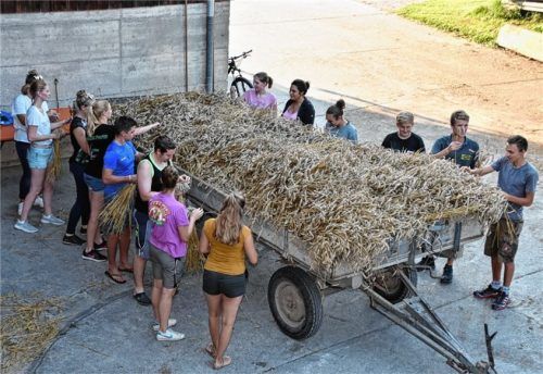 Pruttinger und Vogtareuther Landjugenden binden die Erntekronen für das Rosenheimer Erntedankfest