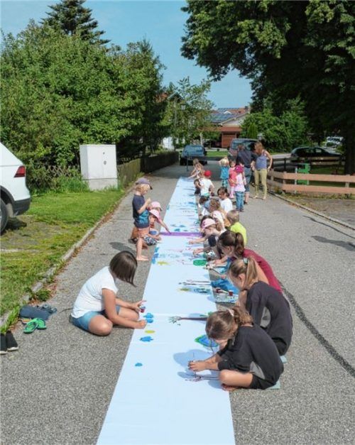Die KFD Höslwang lud Kinder ab zwei Jahren ein, um am längsten Gemälde des Dorfes mitzuwirken. Die Begeisterung war groß, über 20 Künstlerinnen und Künstler hatten viel Spaß am Gestalten des 30 Meter langen Banners am Spielplatz. Diese Woche kann es bewundert werden. Foto re