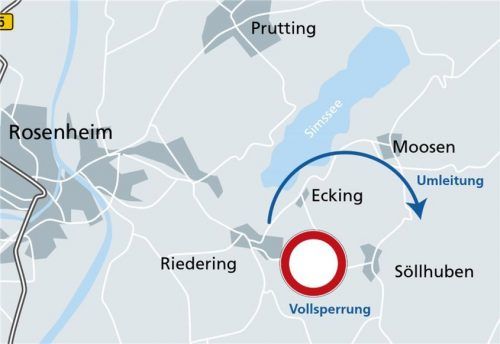In den kommenden Wochen dauert die Fahrt von Riedering nach Söllhuben und umgekehrt etwas länger: Die Staatsstraße 2362 ist wegen Sanierungsarbeiten seit heute in diesem Abschnitt gesperrt. Die Umleitung führt über Ecking. Die Bauarbeiten sollen bis 15. November beendet sein, können sich aber bei sc